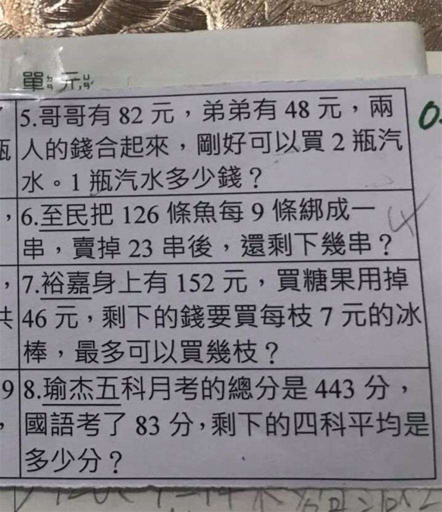 作業本上的第六題「至民把126條魚每9條綁成一串,賣掉23串後,還剩下幾串?」,讓他看完忍不住崩潰喊「應該沒有老闆會賠錢賣吧!」