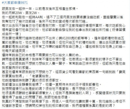 原PO進一步解釋,男友很溫柔很聽話,事事都順著她,偏偏她也不是脾氣多差的人,加上兩人一個月動輒花費10萬元,她雖心疼但也還承受得起,「請問扣掉性別刻板印象的話,我們這種關係真的是對的嗎?我真的不清楚該不該再撐下去。」