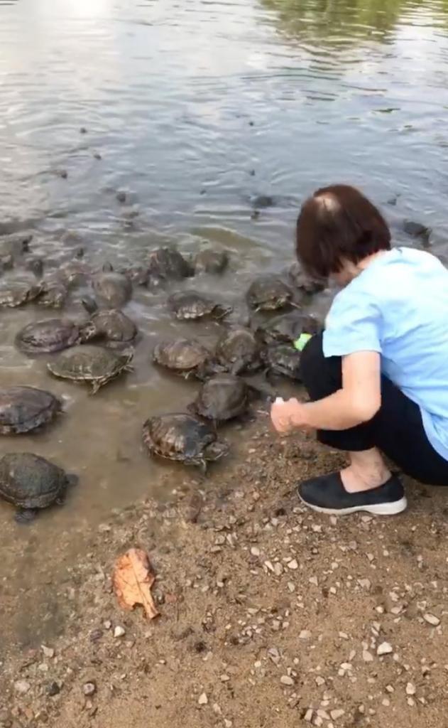 新加坡一名女網友在植物園看到令人覺得可愛的奇觀,一名阿姨手中拿著小刷子蹲池塘邊,她的身旁就是一大群的小烏龜!
