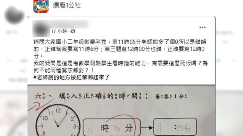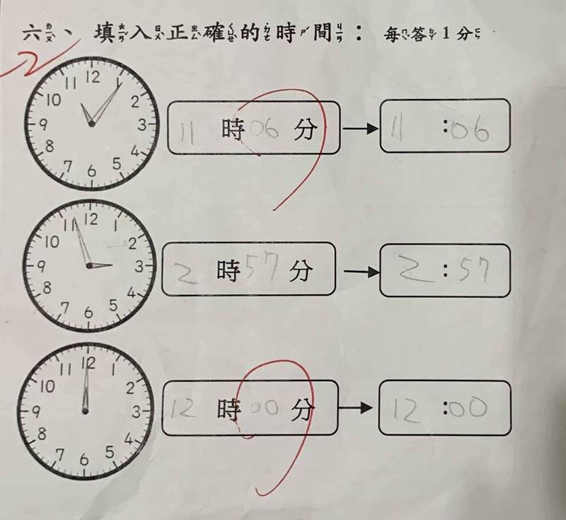 一名網友9日在臉書社團中發文表示,小孩目前就讀國小二年級,數學考卷上的時鐘指著11點06分,小孩也在答案上寫「11時06分」沒想到卻被老師用紅筆圈起來扣了2分,一問之下才知道,「老師說多了個0所以是錯的」,正確答案要寫「11時6分」;另一題寫「12時00分」也是錯的,正確答案應該是「12時0分」。