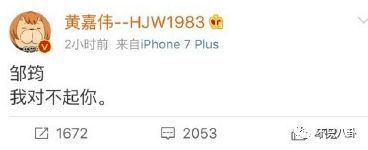 黃嘉偉發了一條微博,向妻子鄒筠道歉:「我對不起妳」。✪