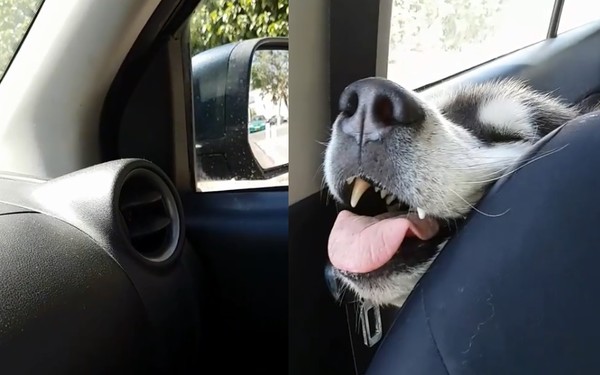 當他一轉頭,Luna的臉大概只有一公分那~~~麼近,就卡在副駕駛座的縫縫裡,瞇著眼睛正在感受出風口送出來的「一陣冷風」,對…沒錯就是這個溫度,本汪熱到快升天了!只見牠張大嘴巴、一副想吸更多冷氣的模樣,真的超級天然呆!