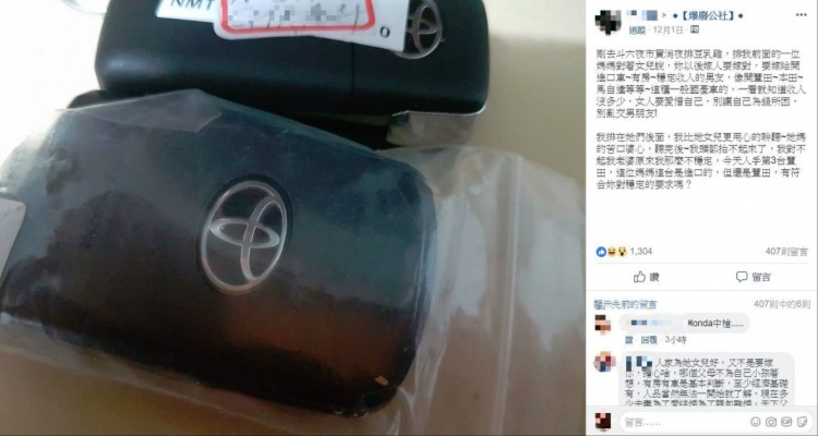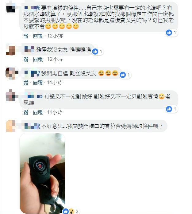 一名男網友在臉書PO文,他寫道,在夜市排隊買宵夜,聽到前面有位媽媽苦口婆心地對女兒說,「妳以後嫁人要嫁對,要嫁給開進口車、有房、穩定收入的男友,像開豐田、本田(Honda)、馬自達(MAZDA)等等,這種一般國產車的,一看就知道收入沒多少,女人要愛惜自己,別讓自己為錢所困,別亂交男朋友!」