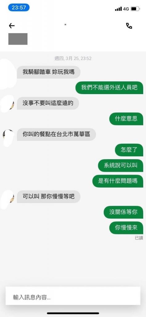 訂餐的網友表示,自己並沒有催促外送員,反倒是外送員劈頭就是質問是不是在找他麻煩,然後責怪消費者訂餐的地點是在萬華區,這樣他騎腳踏車要騎很遠,但消費者表示是點餐系統說可以點的,如果嫌遠其實可以不要接單呀,而且自己也沒有催單,反而是外送員很不客意的烙話『那你慢慢等吧!』讓人實在不懂到底是在生氣幾點的?!