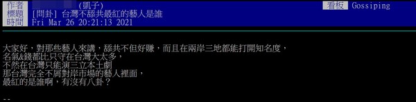 一名網友在社群論壇PTT上發文表示:「大家好,對那些藝人來講,舔共不但好賺,而且在兩岸三地都能打開知名度,名氣和錢都比只守在台灣大太多,不然在台灣只能演本土劇」最後原PO好奇發問「那台灣完全不屑對岸市場的藝人裡面,最紅的是誰啊,有沒有八卦?」
