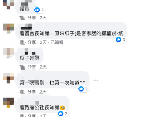 網友們看到後紛紛留言說,「瓜子」的發音唸起來就是客家話的「掛紙」:「掃墓的客家話稱為『掛紙』,意思是將紙掛在墳墓上,這個原是形容動作的詞彙,被引申為指稱掃墓的名詞,用客家話講這名詞聽起來像瓜子」、「客家老闆啦」、「客家人說的掃墓」、「客家人覺得親切」。