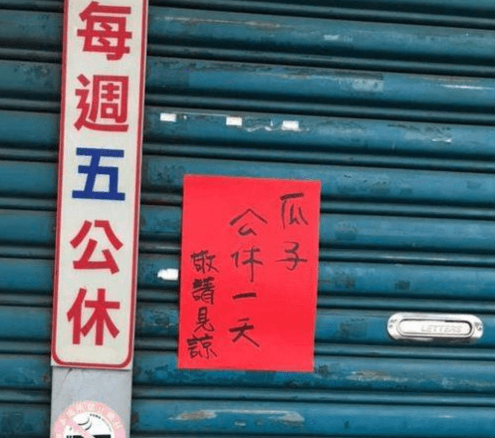 店家公休時通常會在門口貼出告示。日前一名網友在臉書社團「路上觀察學院」po文說,自己到一間店用餐時,發現鐵門上貼了一張奇怪的告示,上面竟然寫著「瓜子,公休一天,敬請見諒」。他非常疑惑,就拍照po上網,詢問網友「瓜子」是什麼意思?