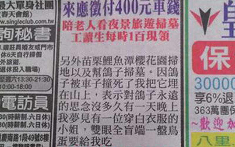 有網友在批踢踢分享一張2015年在報紙上的徵人啟事,引發熱議