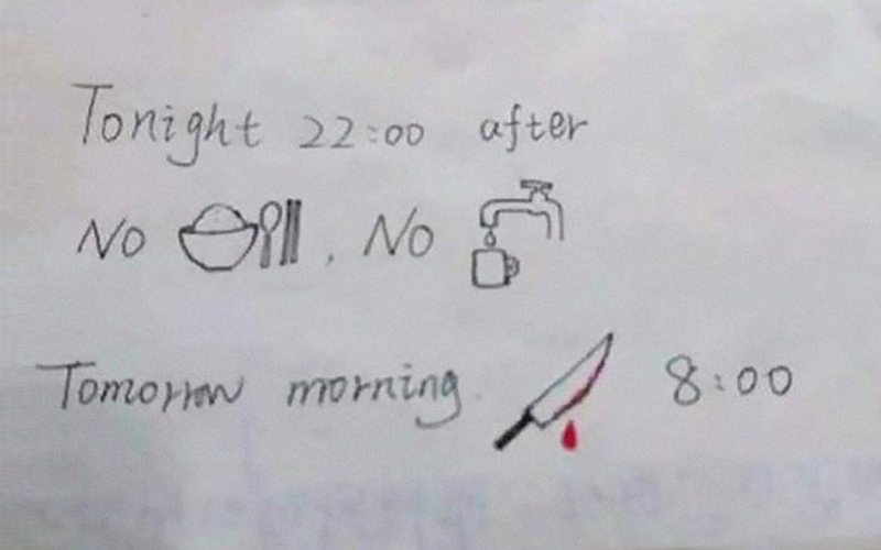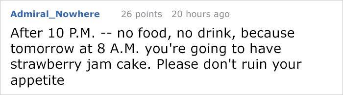 「今晚10點後不提供食物,也不提供水,因為明早8點你會吃到草莓果醬蛋糕。」