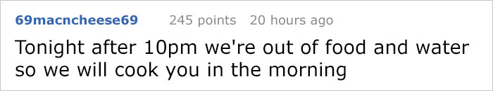 「今晚10點後我們的食物和水會耗盡,我們將在明早把你吃掉。」