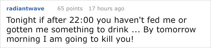 「如果今晚10點後你還沒有給我準備好食物和水,明天早上我會宰了你。」