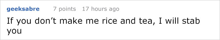 「如果你不準備好米飯和茶,我會用刀好好教訓你。」