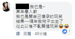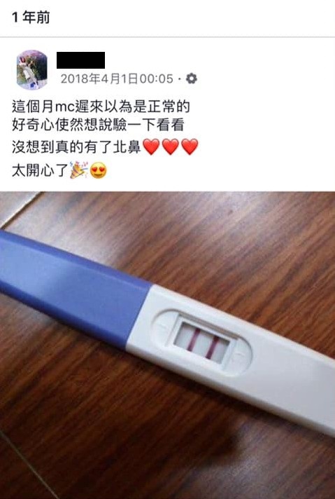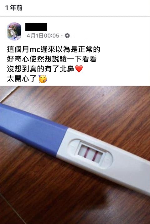 黃姓女網友在臉書社團中po文表示「玩笑不要亂開…」接著附上了兩張照片,其中一張是去年4月1日,她在臉書上所開的玩笑:「這個月mc遲來以為是正常的,好奇心使然想說驗一下看看,沒想到真的有了北鼻!太開心了!」
