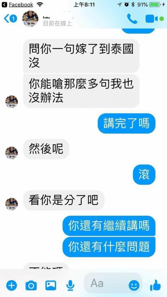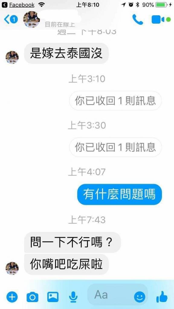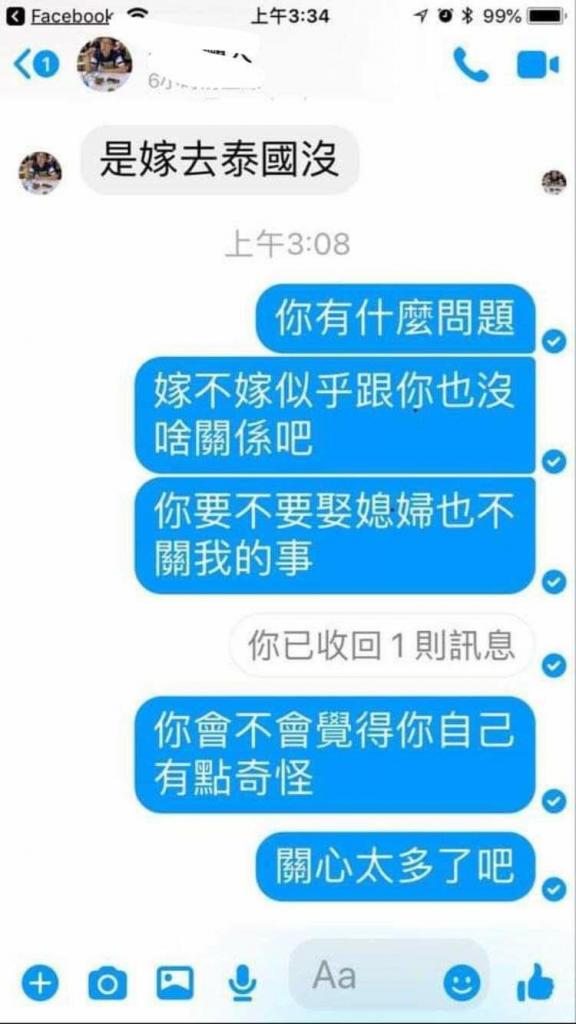 劈頭見男生質問自己嫁去泰國了沒,讓她覺得莫名其妙,在生氣回覆後,似乎覺得自己語氣太過激動於是將訊息收回,不料還是被前男友看到慘遭辱.罵。