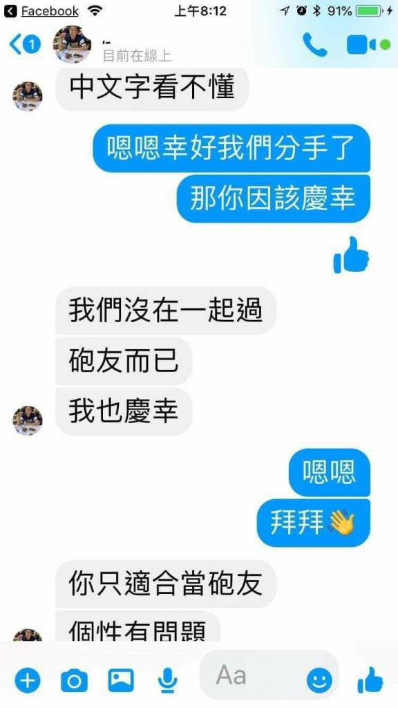 前男友也因不甘被罵說出「我們沒在一起過,只是火包.友而已」等傷人的話。