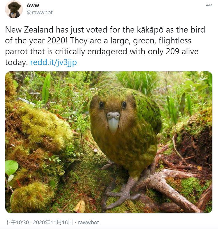 紐西蘭非營利組織「森林與鳥」從15年前起每年舉辦「紐西蘭年度雀鳥」的評選,2020年的結果在11月16日揭曉,拔得頭籌的是全世界最重也最長壽的鸚鵡「鴞鸚鵡」,這也是牠第2次拿下冠軍。