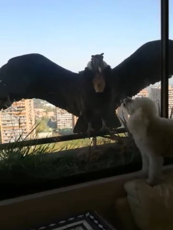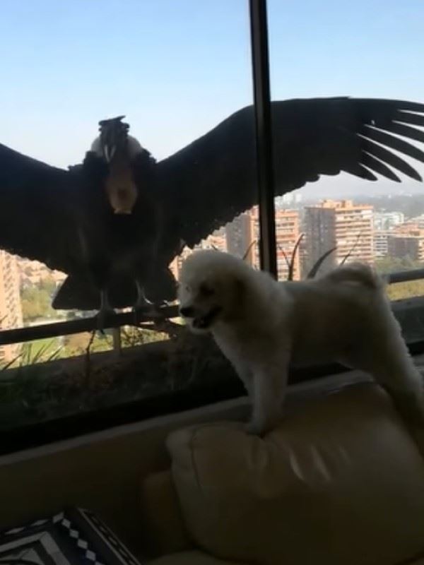 由於安地斯神鷹是南美洲的一種禿鷹,也是西半球最大的飛行鳥類,翅膀張開時可長達約3公尺左右,是包含智利在內幾個南美洲國家的象徵,也常常出現在該地的神話傳說故事裡。牠們通常棲息在3000~5000公尺高的懸崖峭壁,主要吃腐肉維生,因為被列為瀕危物種,在都市幾乎看不到牠們,而唐也表示在這裡居住兩年多以來,從沒見過也沒聽過這類的大鳥出沒在市區,可能是因為街上少了人類,安地斯神鷹才飛到空蕩的城市裡找東西吃,只是一次出現兩隻而且還向著屋內探頭探腦的,讓狗狗當場崩潰狂叫阿娘喂~