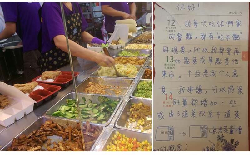 我今天已經幫她做少飯,兩倍菜量了她還是吃不飽,結果寫了這張紙條,我也當面詢問她的想法,她認為60元的菜還要更多,而且我們是學生餐廳,她也有去其他店家要求過加菜不加價….