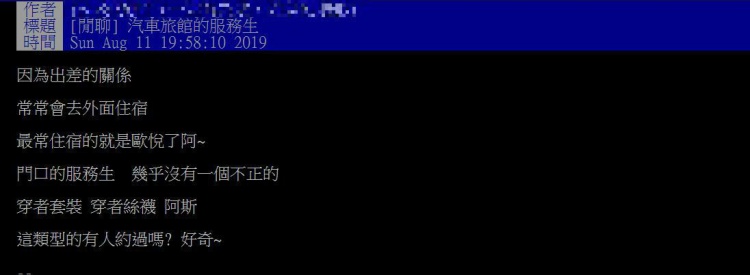 「通常出差的客人舟車勞頓都很累 我遇過的客人也都不帥就算搭訕也是拒絕(所以說就是看臉啦 除非你只打算去那間旅館一次 不然有黑名單會在同業流傳喔」