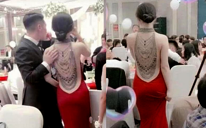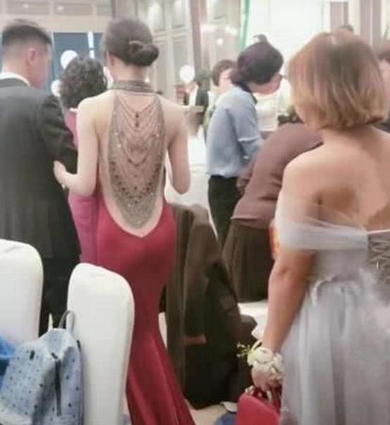 不過看得出新娘的背部是非常挺拔的,一看就是非常有氣質的那種。這件敬酒服雖然說不是特別保守,但是顯示出新娘特別漂亮的背部,也有人叫她美背新娘,不少網友調侃:這麼美麗的背部不去拔罐可惜了!