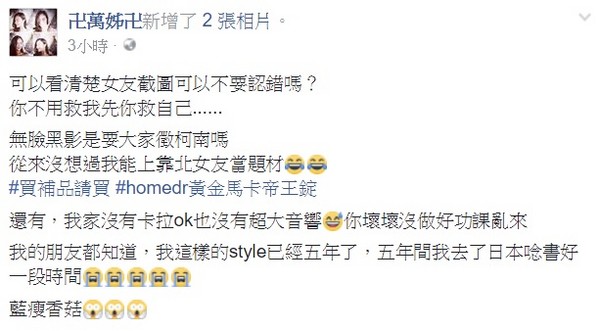 不過此貼文立刻引來網友熱烈討論,還笑說「你朋友看到身材就能認出你女友?李組長要皺眉頭囉!」也有眼尖的網友發現這位「女友」其實就是小有知名的網美「萬姊」。而萬姊本人隨後也在臉書上澄清,「可以看清楚女友截圖不要認錯嗎?從來沒有想過我能上靠北女友當題材,還有,我家沒有卡拉OK也沒有超大音響,你壞壞沒做好功課亂來,我朋友都知道,我這樣的style已經五年了,這五年間我還去了日本唸書好一段時間!」