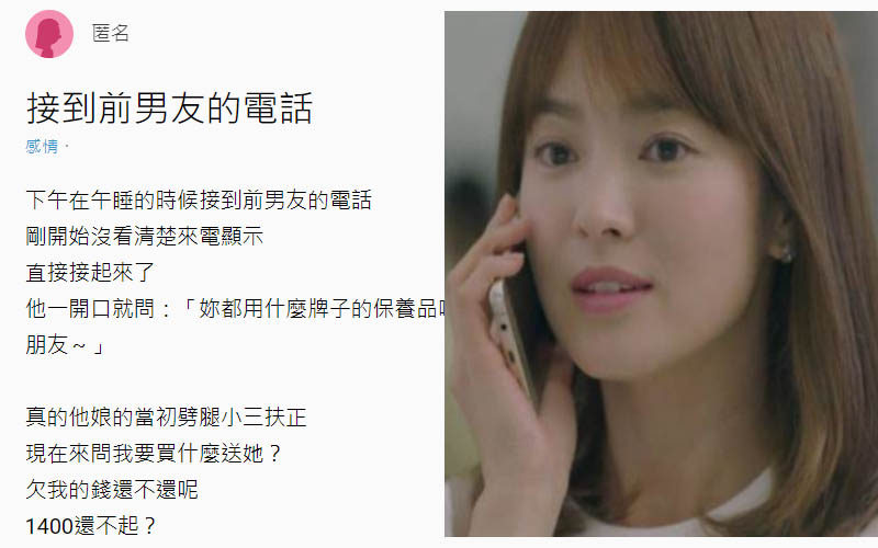 原PO表示,13日下午在午睡時電話突然響起,當時睡眼惺忪也未看清楚是誰來電就直接接起電話,沒想到電話那頭卻傳來「劈腿前任」的聲音,一開口就直問「你都用什麼牌子的保養品啊?情人節快到了我想送給我女朋友~!」語氣中滿是嘲弄、放閃,而且後方還隱約傳出嘻笑聲。