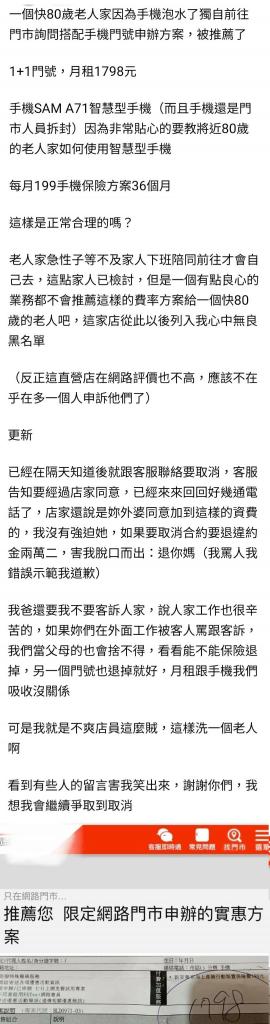 原PO表示外婆是快80歲老人,因為手機泡水又耐不住性子,因此獨自前往門市詢問搭配手機門號申辦方案,被推薦了「月租1798元的1+1門號」方案,搭配的手機是三星A71智慧型手機,並且門市人員也直接拆封手機,教80歲的外婆如何使用,其中還包括了每個月199元的手機保險方案3年。這樣的結果讓原PO氣炸表示,這樣完全不合理。