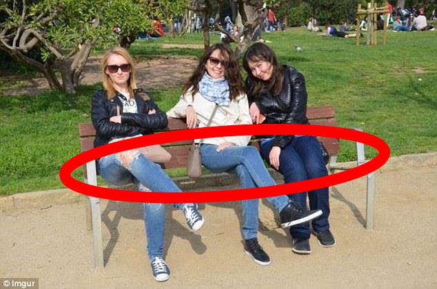 你看出答案了嗎?只見照片中,3個女人坐在公園椅子中,對著鏡頭微笑,但仔細一看,她們屁股底下居然「沒有椅子」!而坐在「空氣椅子」的她們居然看起來坐得很放鬆!但也有網友推測,很有可能是坐椅過短,所以照片沒有拍到。
