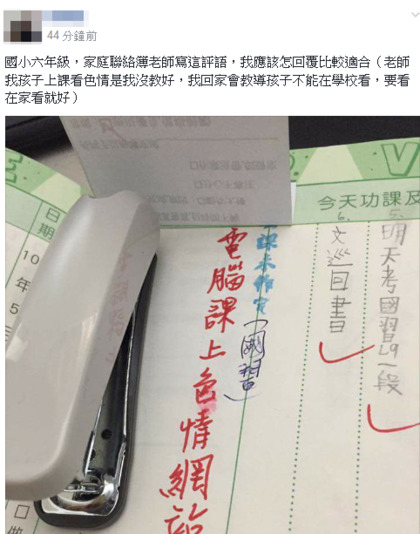 有位爸爸在臉書發文,自己的孩子念國小六年級,沒想到老師竟在聯絡簿留下紅字評語表示,他兒子「電腦課上老司機網站」希望家長多注意。