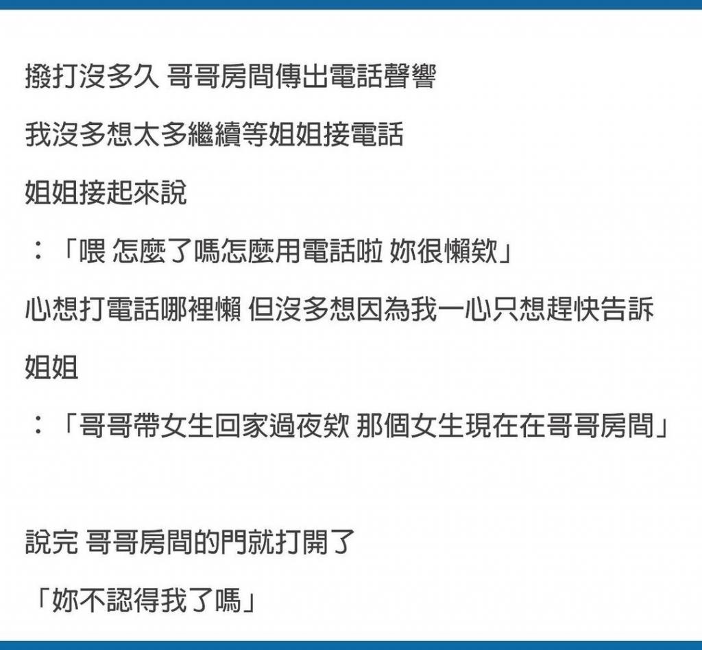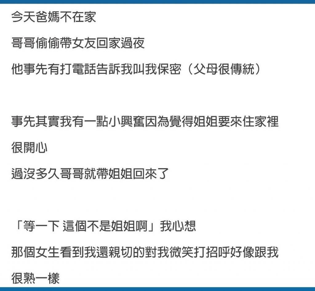 我哥帶了別的女生回房間 ↓↓↓↓↓↓↓↓↓以下全文↓↓↓↓↓↓↓↓↓ 延伸閱讀———— 加入我們的Line群 「惡夢阿姨」,聽更多社會案件/懸疑故事 👉👉 點我加入「惡夢阿姨」 延伸閱讀>>>>>>>> 想聽更多恐怖的傳說!👉歡迎訂閱『下水道先生』 https://reurl.cc/8WEA04 延伸閱讀———————— 事到如今…我要坦白一切 . . . (50071)