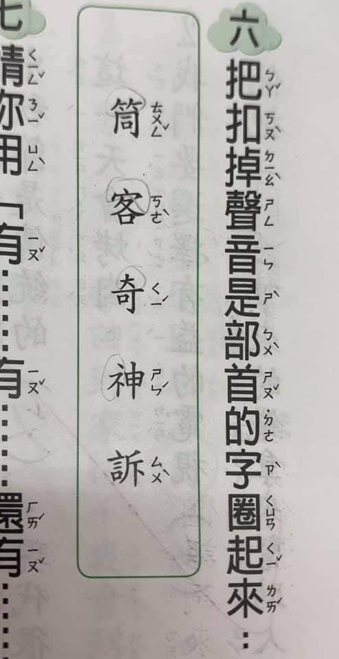 我是小二的安親老師,前天學生問我第六題,我第一直覺是筒、客、神,後來去翻解答,我的直覺沒錯~~