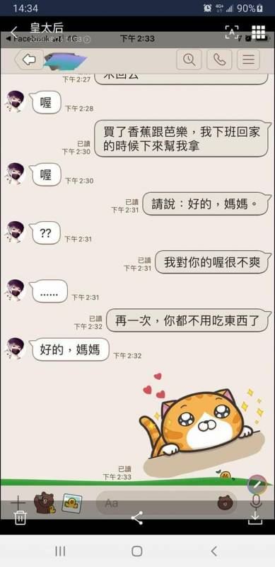 原PO兒子覺得疑惑,回覆了「??」,原PO老婆直接表示「我對你的喔很不爽」,兒子立刻無言的只回應「……」。最後原PO老婆終於忍不住發 怒 的說「再一次,你都不用吃東西了」,兒子馬上示弱回應「好的,媽媽」。