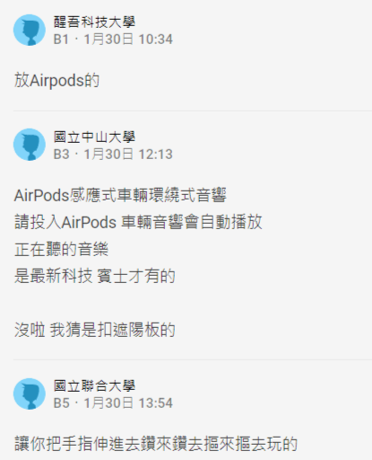 沒想到,po文被徹底歪樓,大票網友紛紛笑回,「AirPods感應式車輛環繞式音響,是最新科技,賓士才有的!沒啦…我猜是扣遮陽板的」、「讓你把手指伸進去,鑽來鑽去摳來摳去玩的」、「快被AirPods笑死」、「不影響我開我的藍寶堅尼」