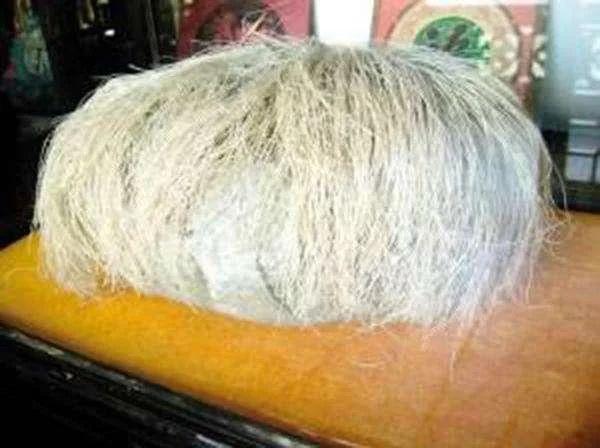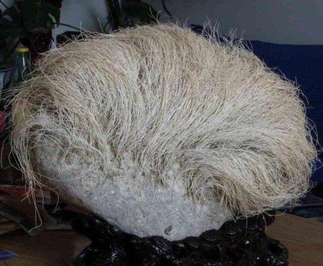 看到這塊石頭,小張就非常感興趣,因為這塊石頭像個人的頭部,下部是一塊普通的鵝卵石但是上面竟然生長著數千根“白髮”,比人的頭髮略粗。並且據賣家說,這白髮還在繼續生長。