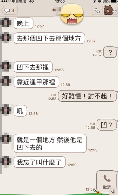 最後女友又給了他提示說是靠近逢甲那個凹下去的啊!最後男網友還是不懂,只能求助臉書上的老司機們,老司機們一看馬上給出正確答案。