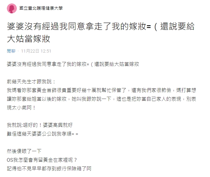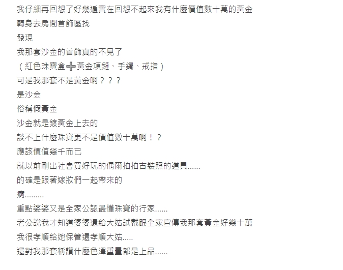 原PO表示,自己當年剛出社會,有買一些看起來漂亮的「沙金首飾」,而婆婆拿走的就是那一盒,別說黃金了,甚至不是珠寶,也不是價值數十萬的東西,然而婆婆已經將首飾拿給大姑試戴,而且還不斷跟所有人誇讚「媳婦真的很孝順」,讓她傻眼:「該如何解釋才好呢?」