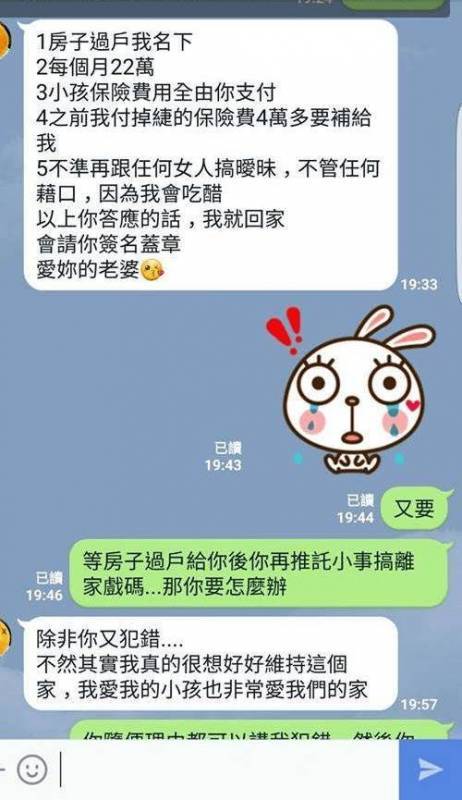 看到老婆提出的條件後,他覺得很心寒,回覆說:「又要,等房子過戶給妳後,妳再推拖小事搞離家戲碼…那妳要怎麼辦」。