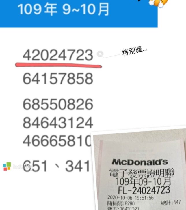 只⾒她在麥當勞消費的發票號碼,與特別獎開出的數字⼀模⼀樣!只不過開頭的前2碼不⼩⼼互換了位置,更令⼈難過的,因為這