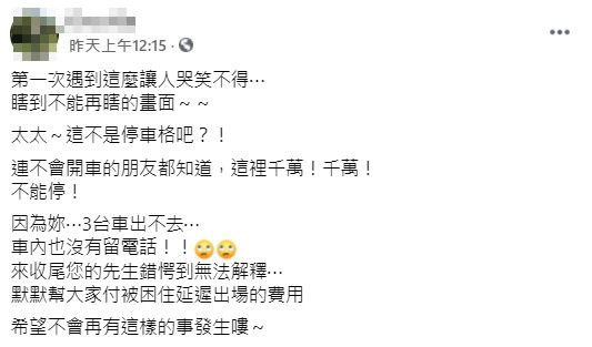 車主的丈夫來收尾時,錯愕到無法解釋。只能默默幫大家付被擋住延遲出場的費用。原po嘆道:「希望不會再有這樣的事發生嘍。」