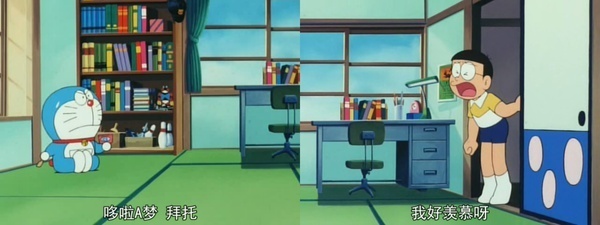 老版動畫出現在大雄房間的戲份,背景基本都是一致的。人物大多是從右側拉門進入,直接到左面參與情節發展。幾個關鍵道具:門,寫字檯(時光機入口),窗戶,書架,一個鏡頭就可以收進來。鏡頭除了平移,不需要旋轉,對於早期的動畫,是個省成本的好方法。