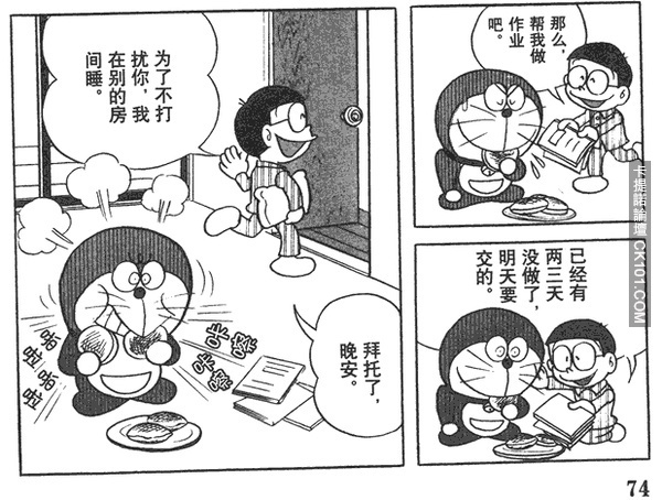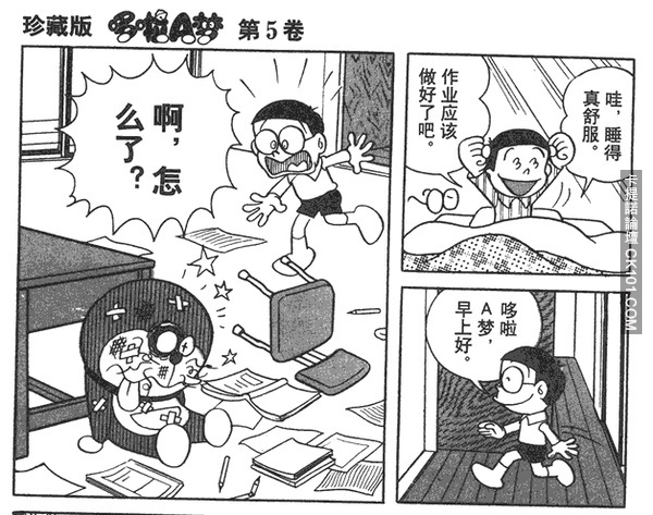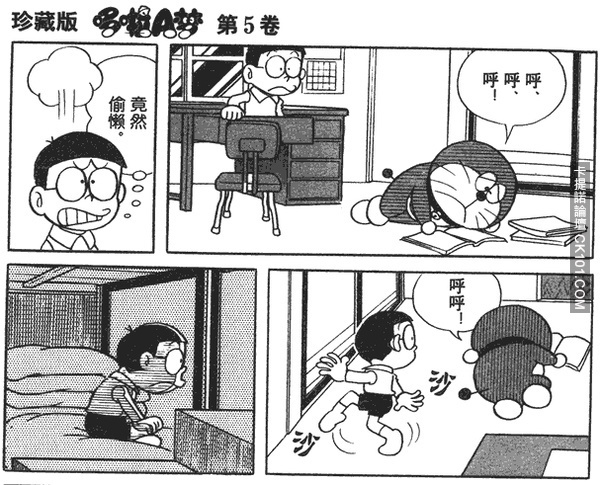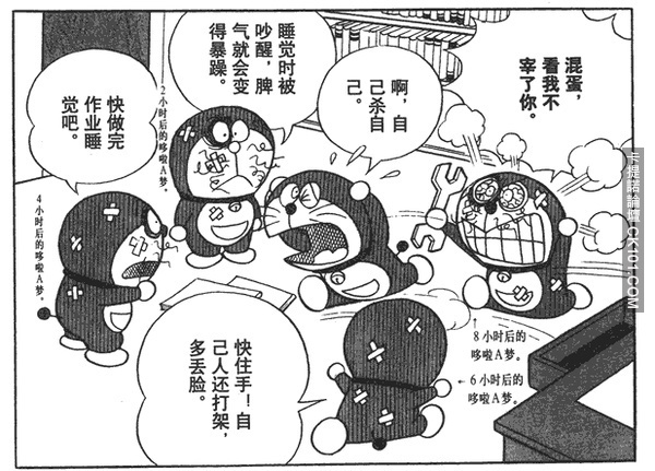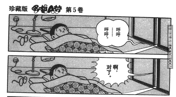 兩個人在一個房間會產生更多的戲劇 衝 突,比如漫畫中反覆出現的一個橋段。大雄睡不著覺,驚醒哆啦 A 夢(如下圖)