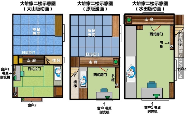 下面是大山版動畫、漫畫、水田版動畫三者對大雄家二樓佈局設定的對比圖