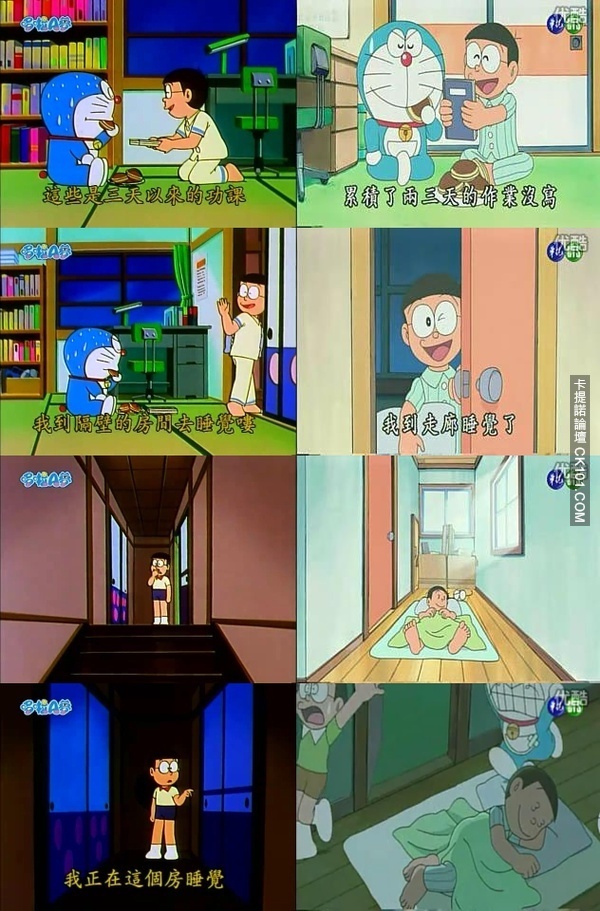 而且為了大雄躲在壁櫥的情節,哆啦 A 夢也一反常態的睡在榻榻米上,沒有回壁櫥。