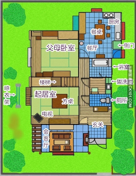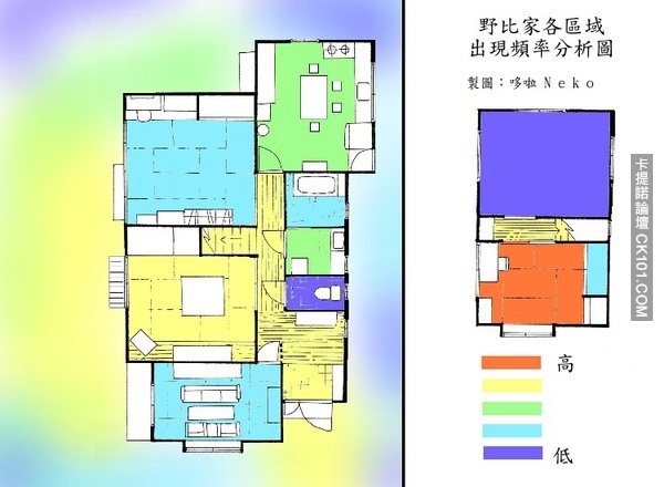 橙色部分是大雄的房間,淡藍色是哆啦 A 夢的壁櫥,黃色是走廊和樓梯,紫色部分就是奶奶的房間,出現頻率是最低的。