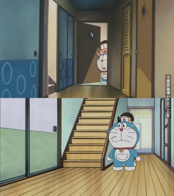 下圖 2008《大雄的新魔界冒險》,父母被驚醒,從起居室跑出。對比上下兩圖,兩種設計中樓梯方向都不同。
