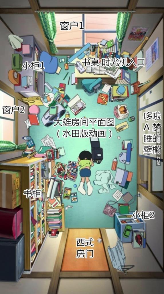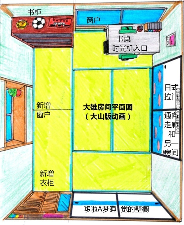 下面這幅是大山版動畫中大雄房間示意圖,可以看到出入房間的門是日式的拉門。門在時光機出口所在的抽屜的右側。和漫畫設定有很大出入,為什麼呢?