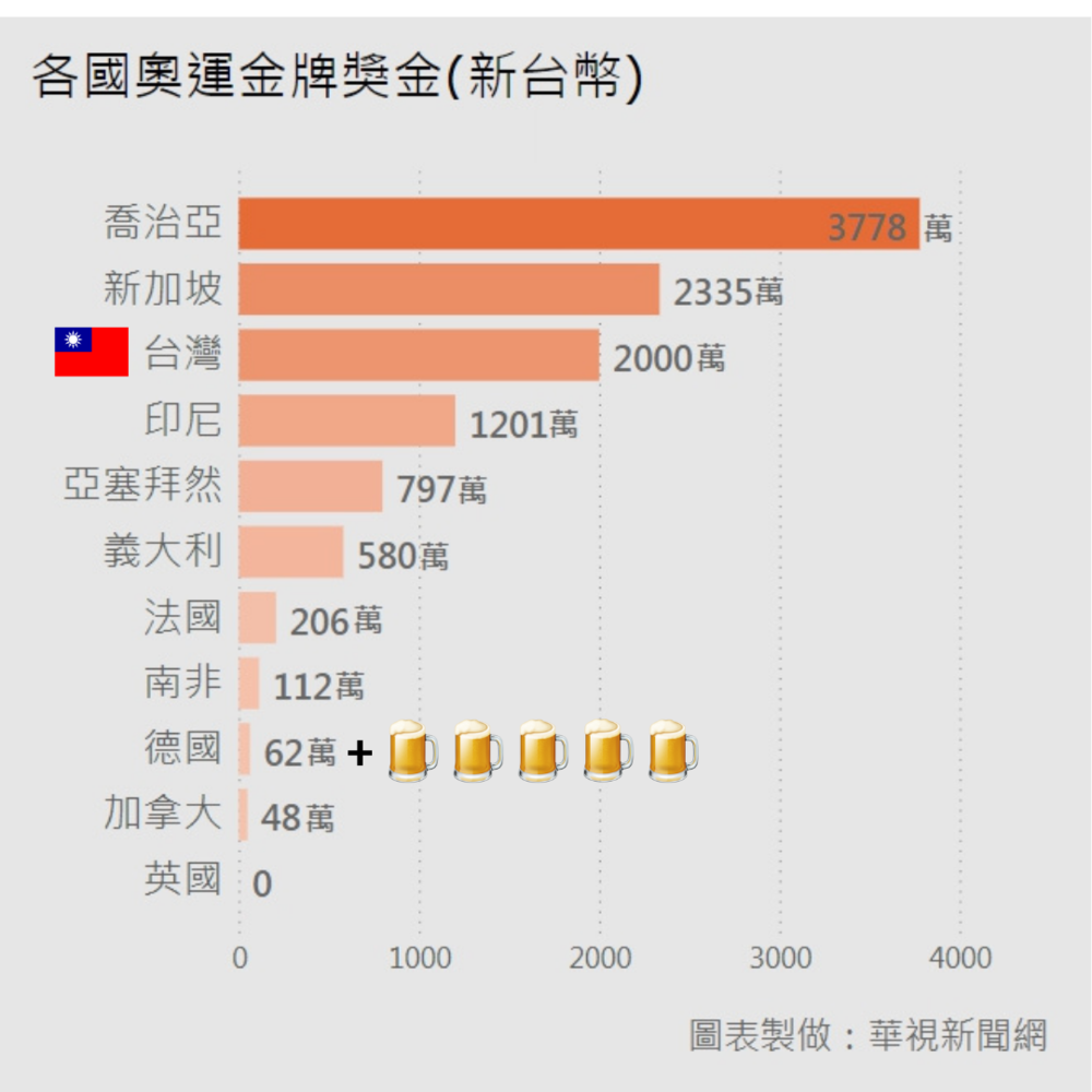 奧運是各個國家頂尖選手的必爭之地,在奧運上獲得佳績,不僅是對選手實力的肯定,也是國力的展現。因此許多國家都提供了高額獎金,一方面吸引選手努力打拚,一方面也是獎勵為國爭光的選手。台灣選手若在奧運中拿下金牌,可拿到2000萬元,獎金額度名列世界第3高,僅次於喬治亞和新加坡。也有的國家祭出免當兵、啤酒暢飲等花式獎勵,如南韓和德國。