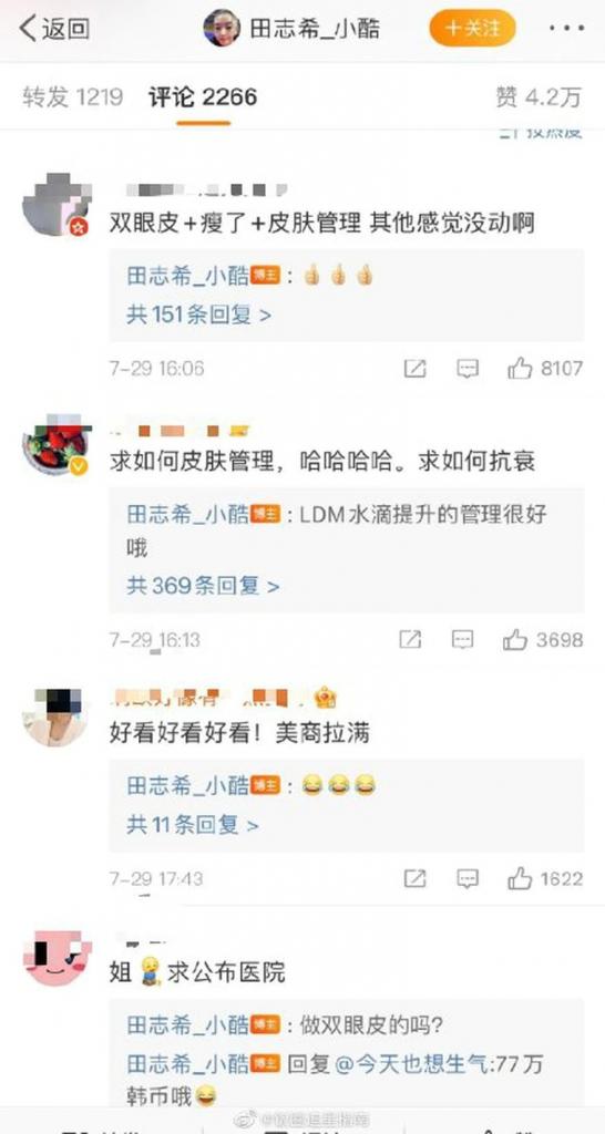 不少網友對田志希的大進化感到吃驚,紛紛讚嘆「超強換頭術」、「絕了」,田志希本人也不否認整形,還在網路上親回需要花的費用,並表示自己平時都有做好皮膚管理。