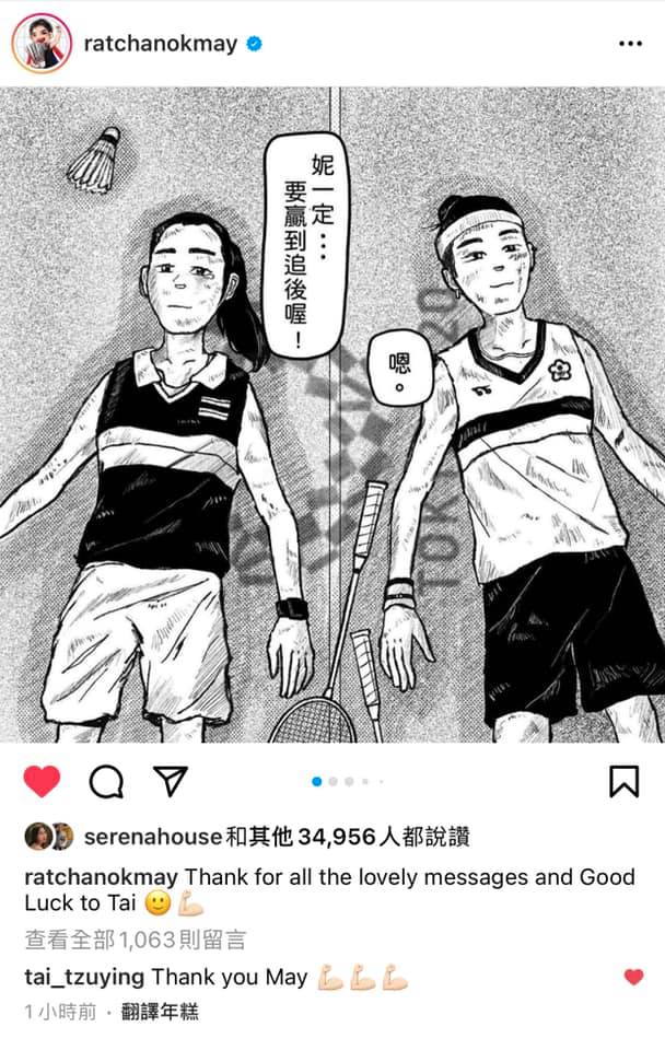 而在昨日4強賽時,戴資穎表現可圈可點,首局21比18拿下,第2局21比12以直落二,擊敗印度一姐辛度成功復仇。事後戴資穎也在IG上貼出小腿照,直言「腿兒,再撐一場,加油!」,而在8強賽遇到的泰國選手依瑟儂也發IG,用可愛的插畫替戴資穎加油,相當溫馨。