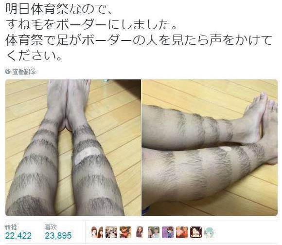 事情的起源是這樣的,日本一高中生在體育祭(運動會)前把自己的腿毛剃成橫條紋,po到推特上,據說是要為運動會助興,還說「體育祭上把腿剃成橫條紋的都來打聲招呼唄~」。